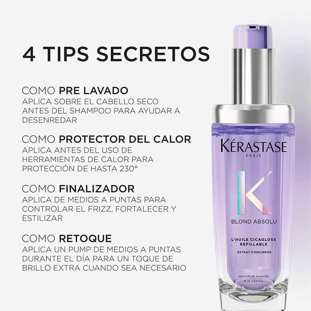 Aceite nutritivo que aporta brillo intenso y suavidad al cabello rubio o decolorado. Repara la fibra dañada y controla el frizz, dejando un acabado luminoso y sedoso. También está disponible su recarga, la cual puedes adquirir de forma individual cuando necesites.