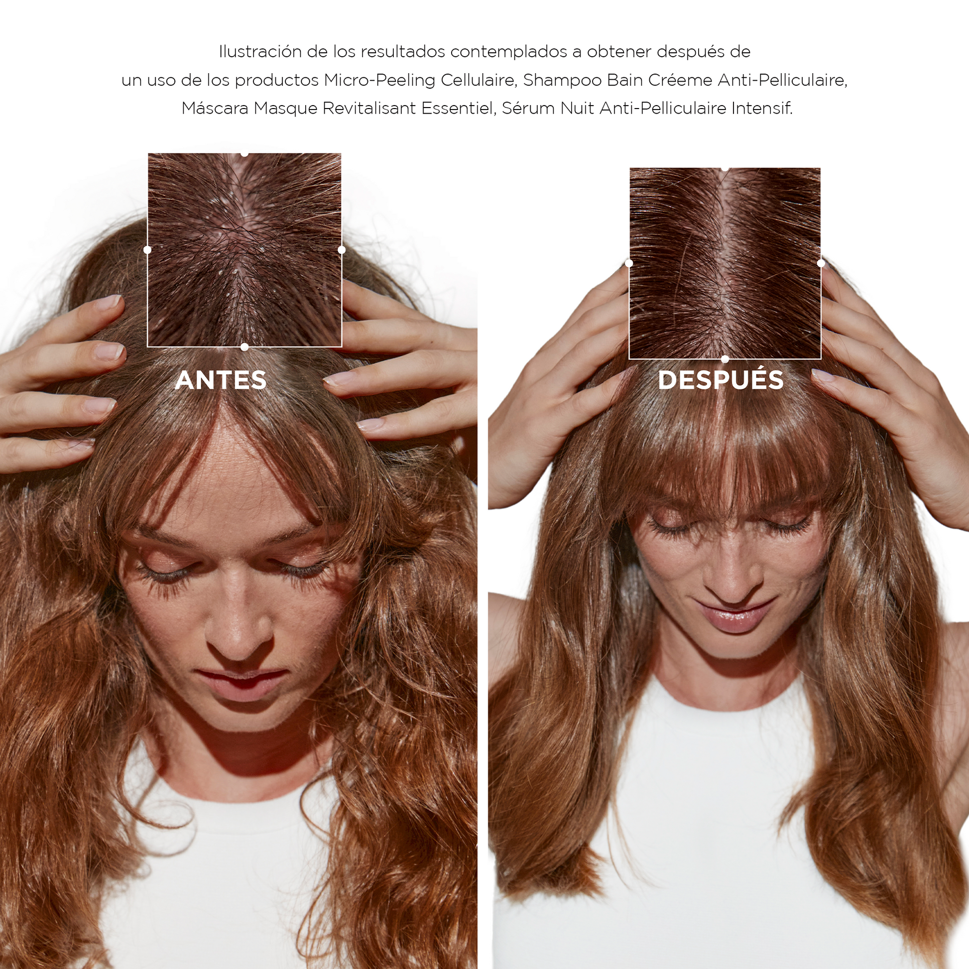 Exfoliante celular micro-peeling para cuero cabelludo con caspa. Elimina células muertas, impurezas y residuos, estimula la microcirculación y prepara el cuero cabelludo para los tratamientos anticaspa.