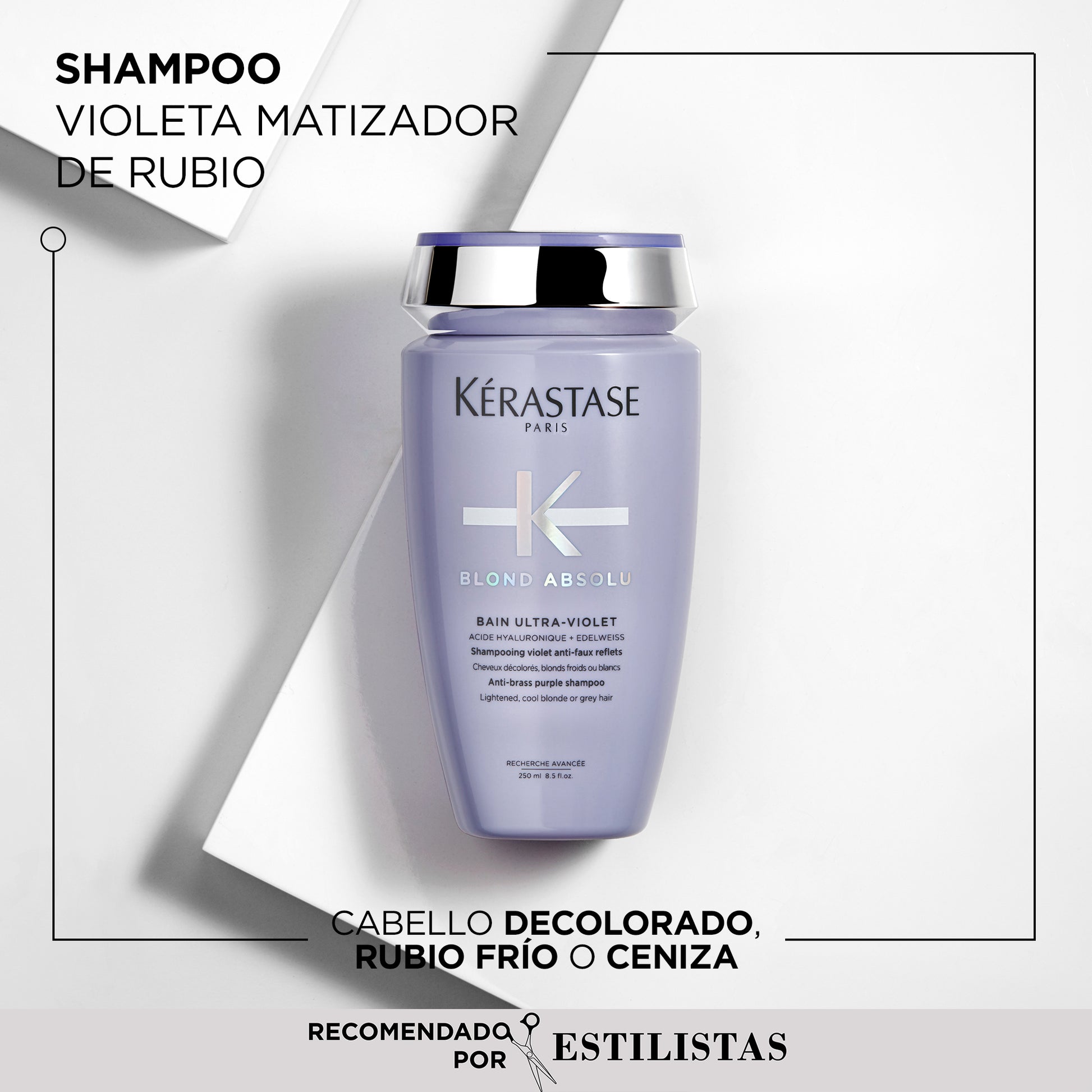 Shampoo matizador que neutraliza instantáneamente los tonos amarillos y dorados no deseados en cabellos rubios o canosos. Repara la superficie del cabello, fortalece la fibra y aporta un brillo frío y radiante.
